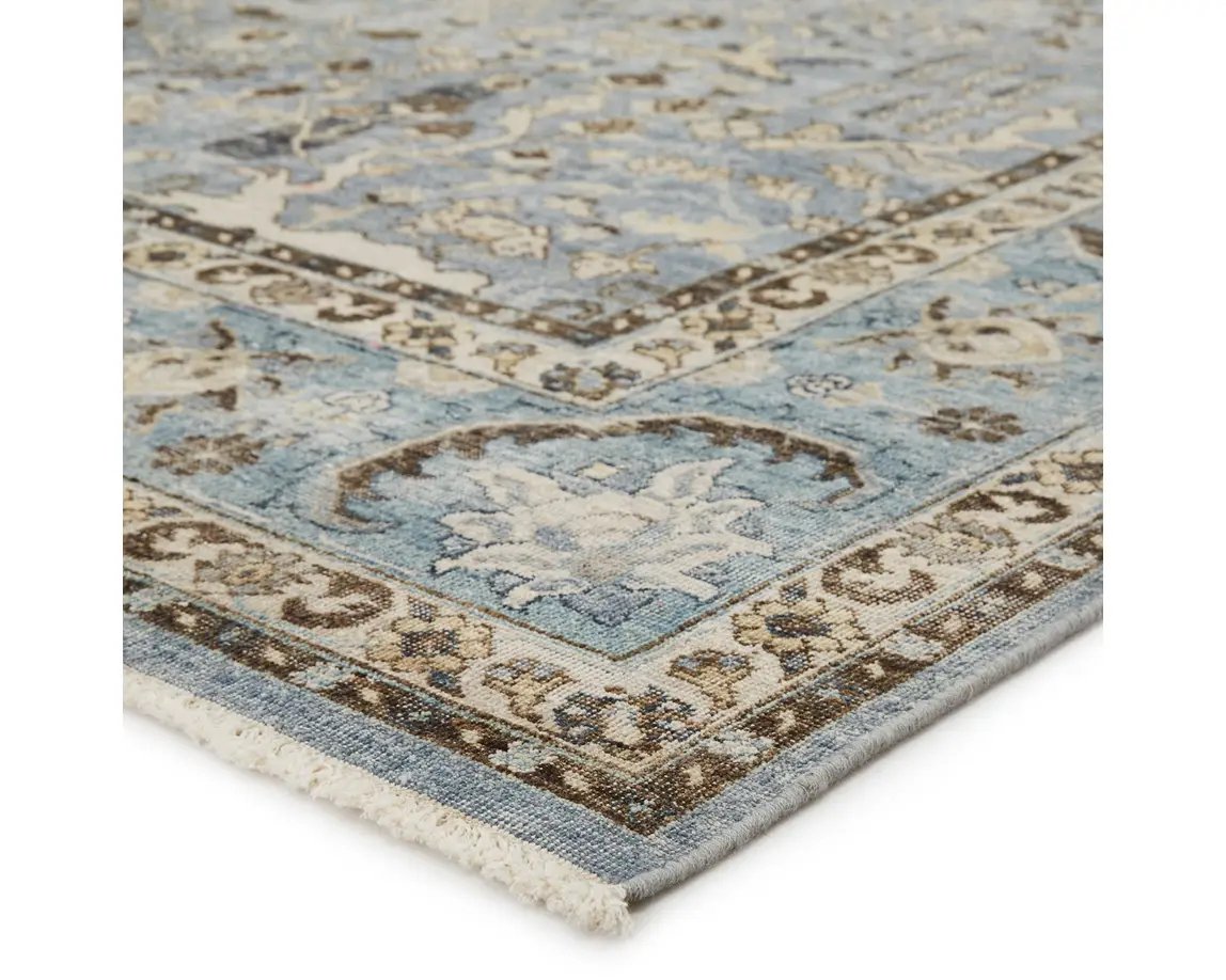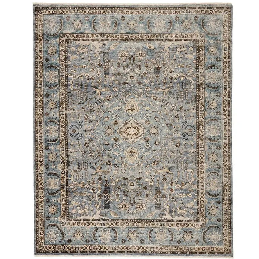 In serene tones of slate blue, green, golden tan, and deep brown, this inviting area rug grounds spaces with luxe appeal and exceptional hand-knotted quality. Crafted of handspun wool, this artisan-made rug boasts an authentic, time-worn look.