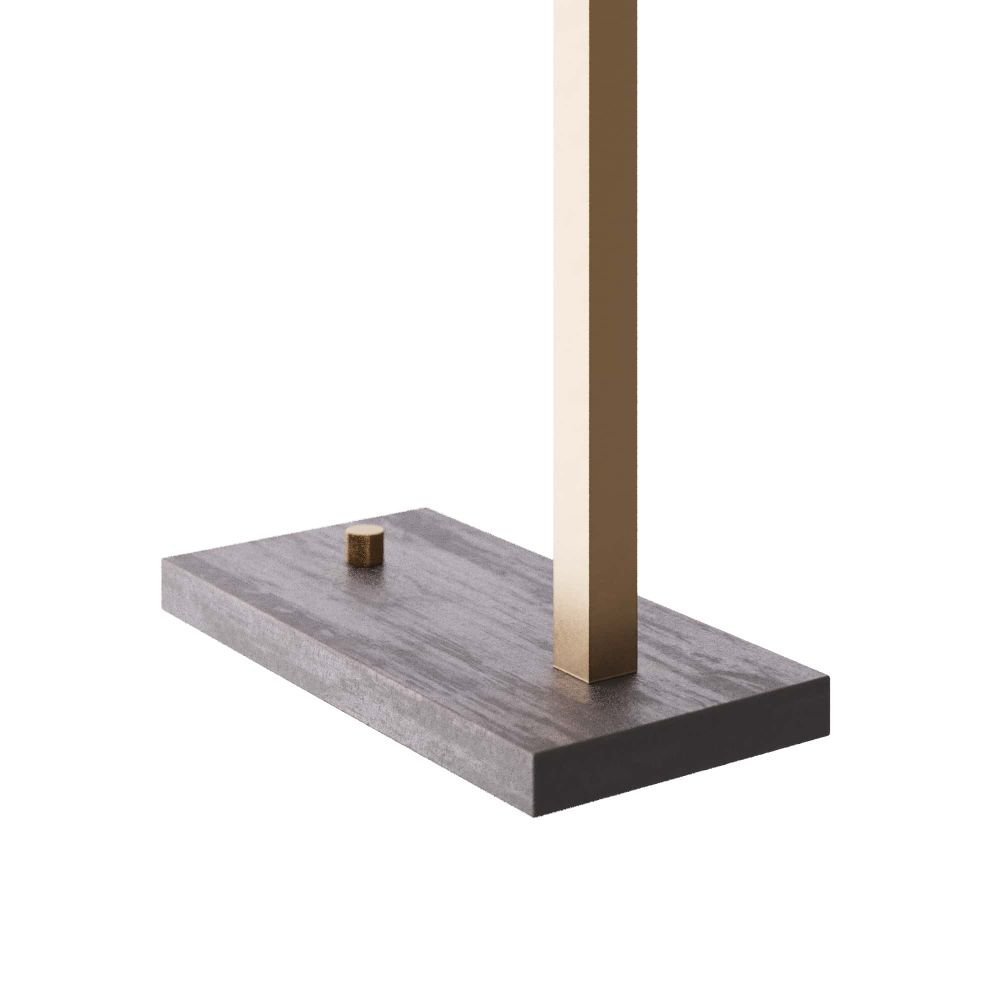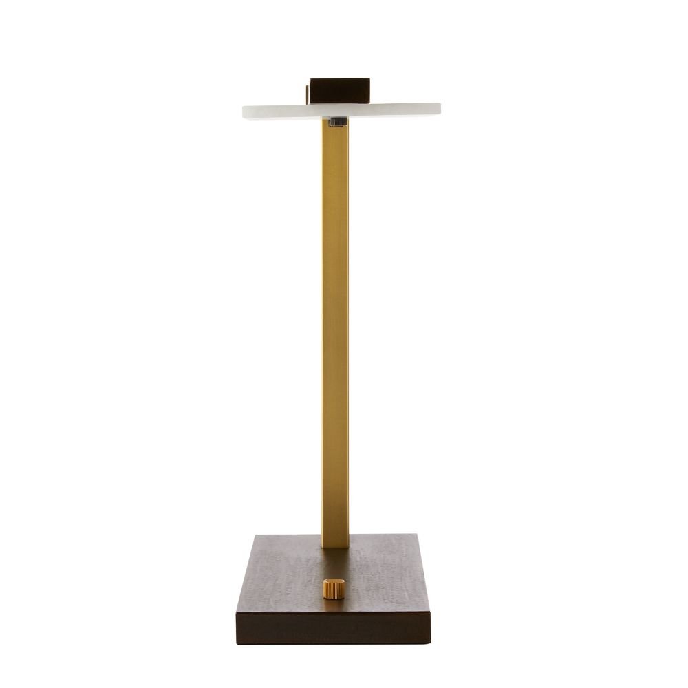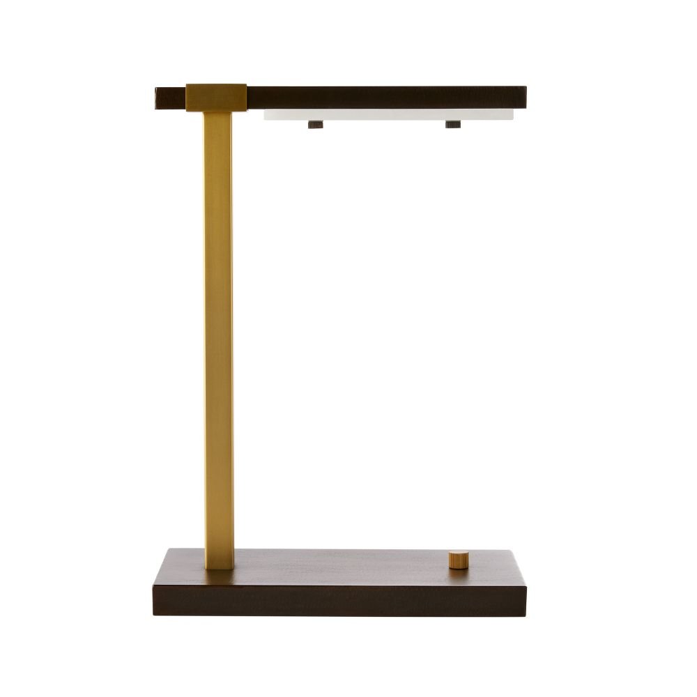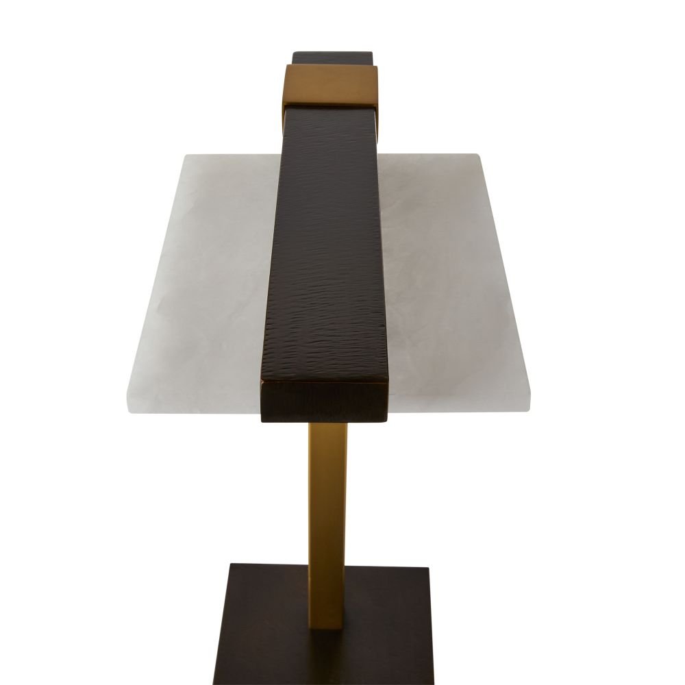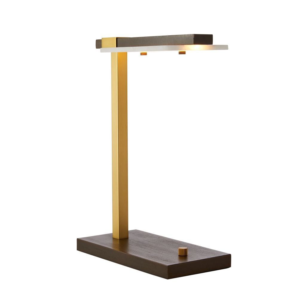 This sleek, modern LED desk lamp is created in an L-shape silhoutte, with a chattered antique brass stem and contrasting english bronze base. A plate of white alabaster forms a diffuser, casting soft surface illumination. The knurled, antique brass dimmer knob rests atop the base, adding embellishment and grip.