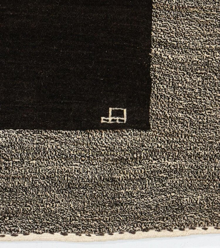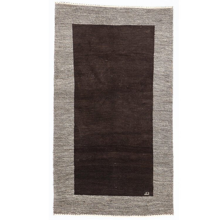 This hand-knotted Gabbeh rug from late 20th-century Persia features a striking central square motif, emblematic of the tribal artistry and minimalist design found in traditional Gabbeh weavings. Crafted from hand-spun wool and naturally dyed, it showcases a rich blend of contrasting gray and brown tones. The medium pile and bound edges offer durability and texture, making it a timeless piece that complements modern, rustic, or bohemian interiors with understated elegance.