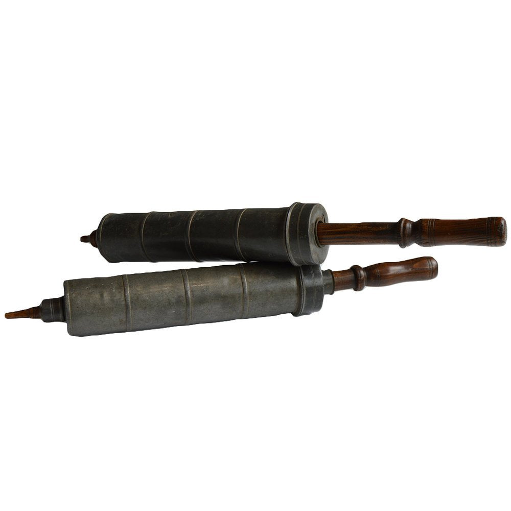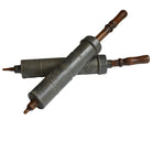 Two vintage oil pumps. Body of the pump is metal. The head and the push pump are wooden.