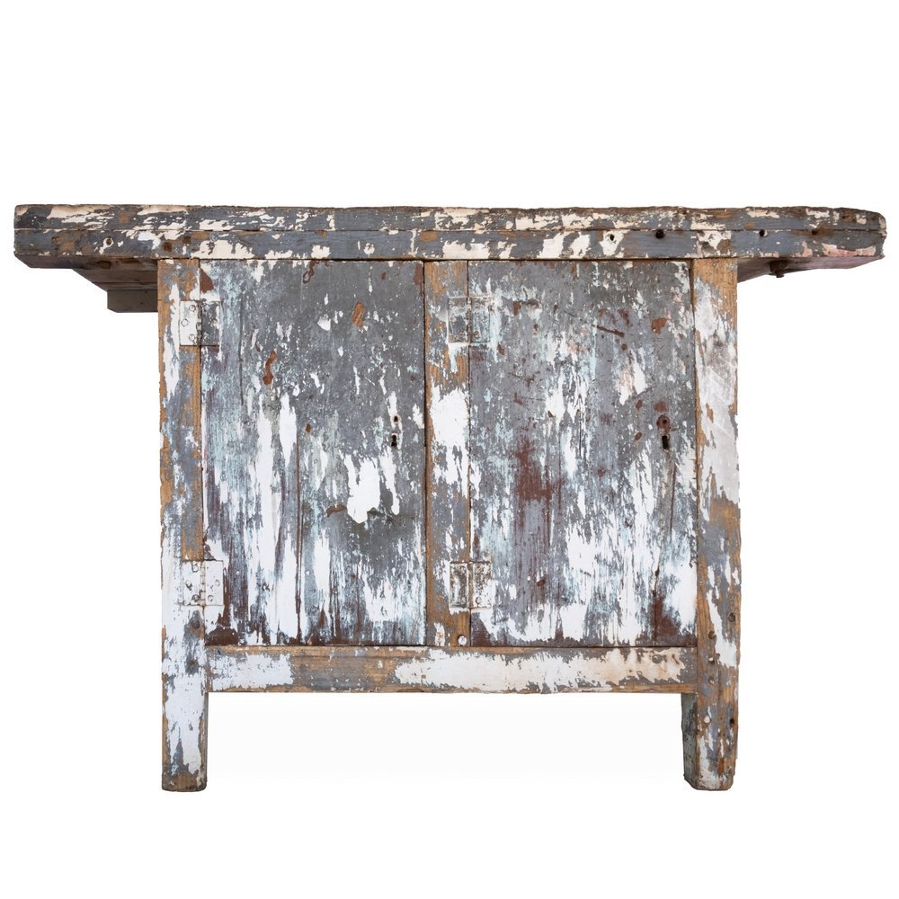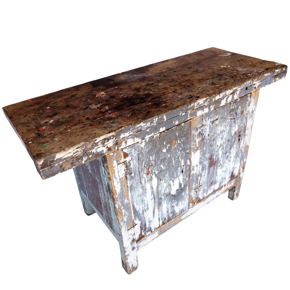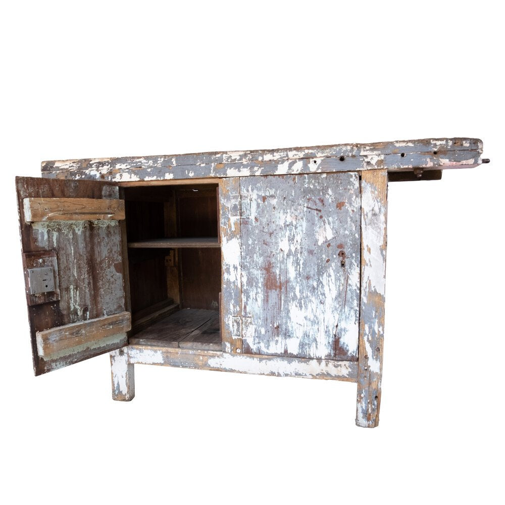 Vintage wood bench with an exciting paint pattern and a two-door storage cabinet.